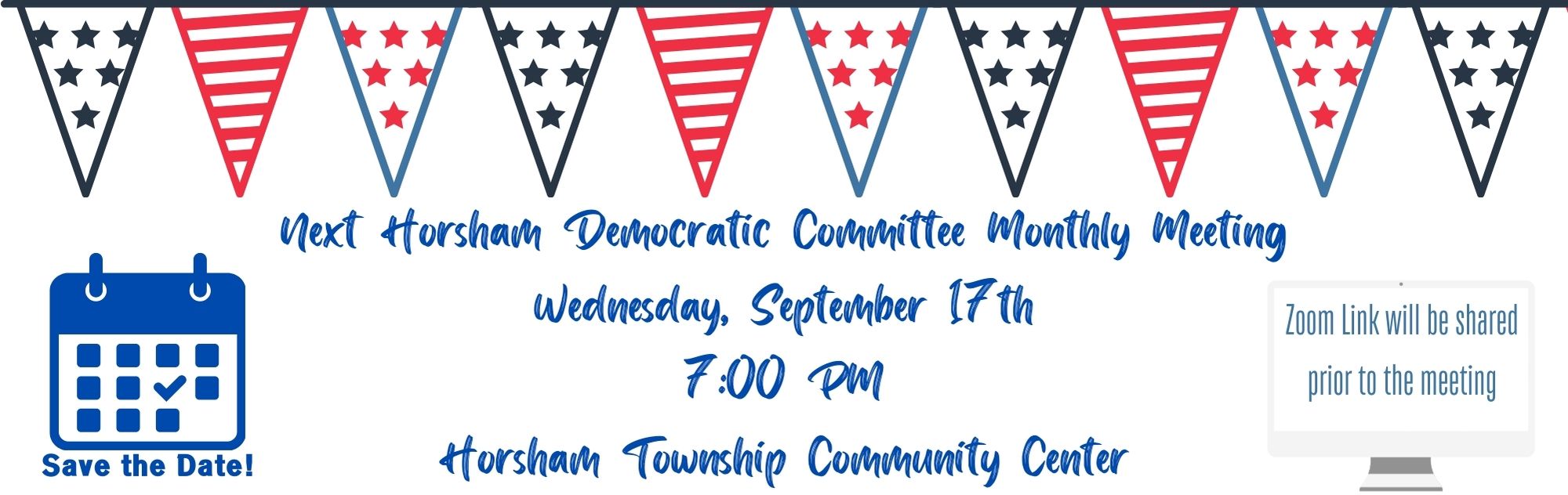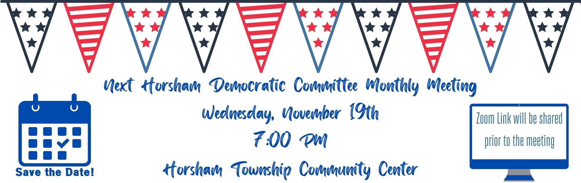Our next monthly meeting of the Horsham Democratic Committee will take place on Wednesday, November 19th at 7:00 PM at the Horsham Township Community Center.